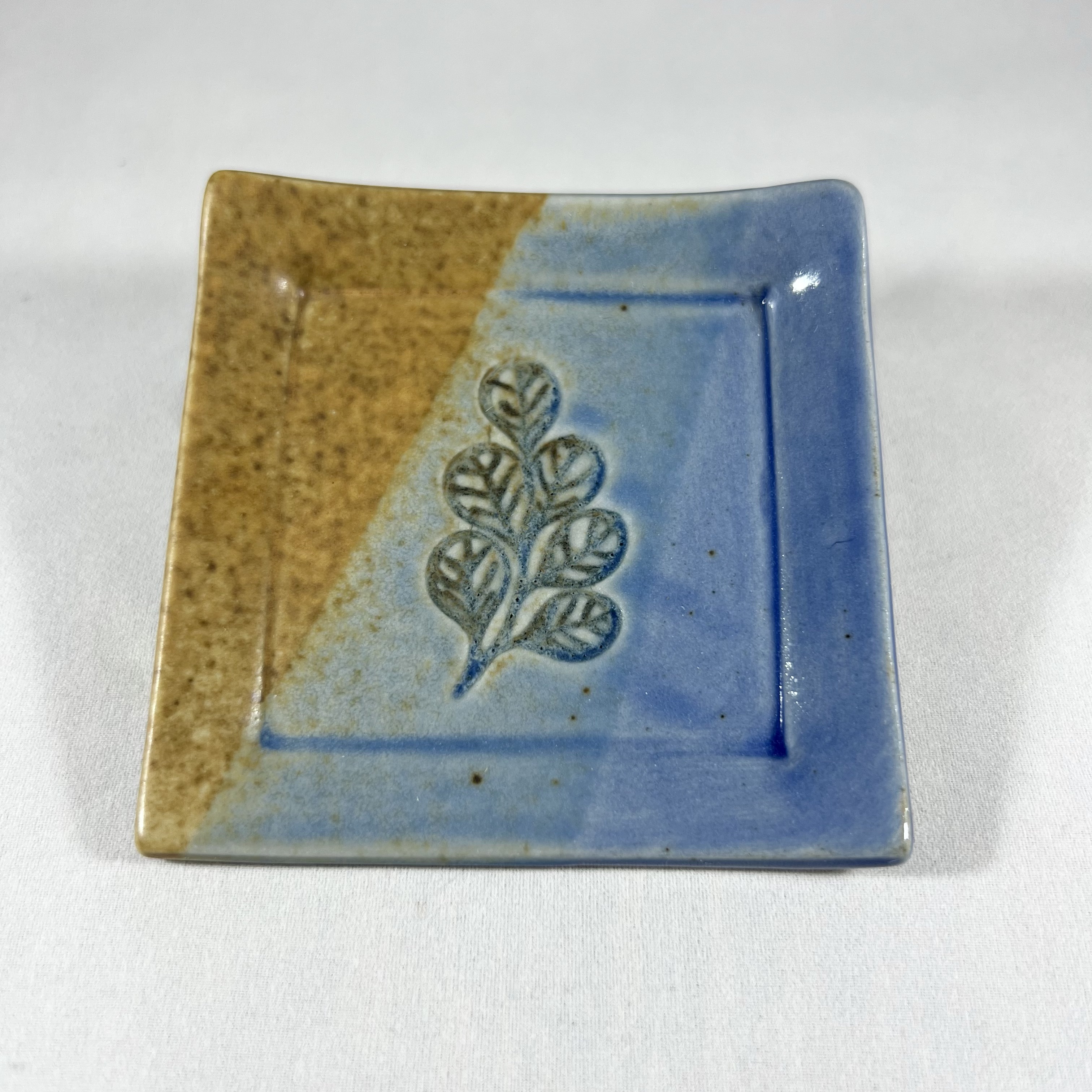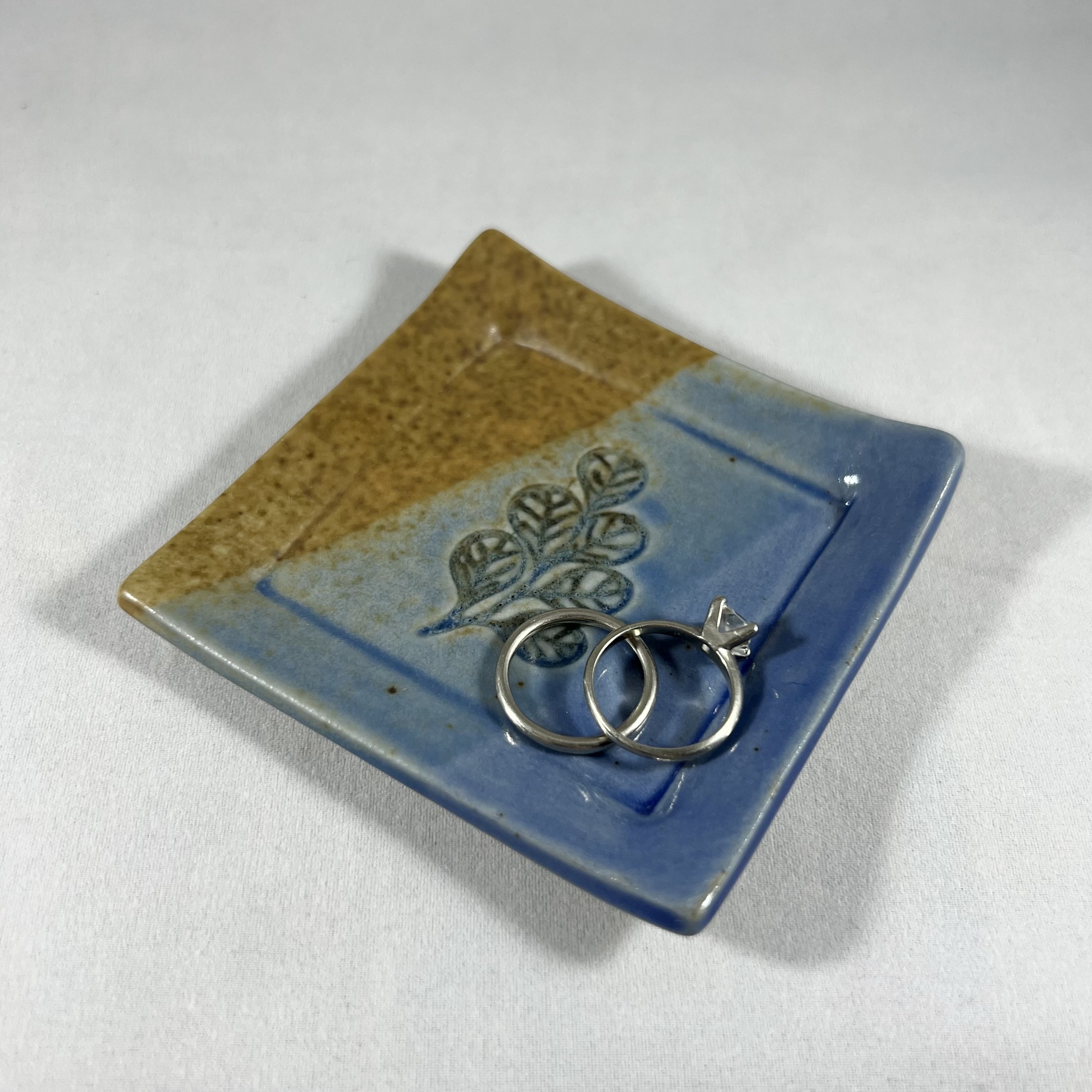 This striped trinket tray was hand-built and stamped with a little plant. It is perfect for your rings, chapstick, or whatever happens to be in your pockets!