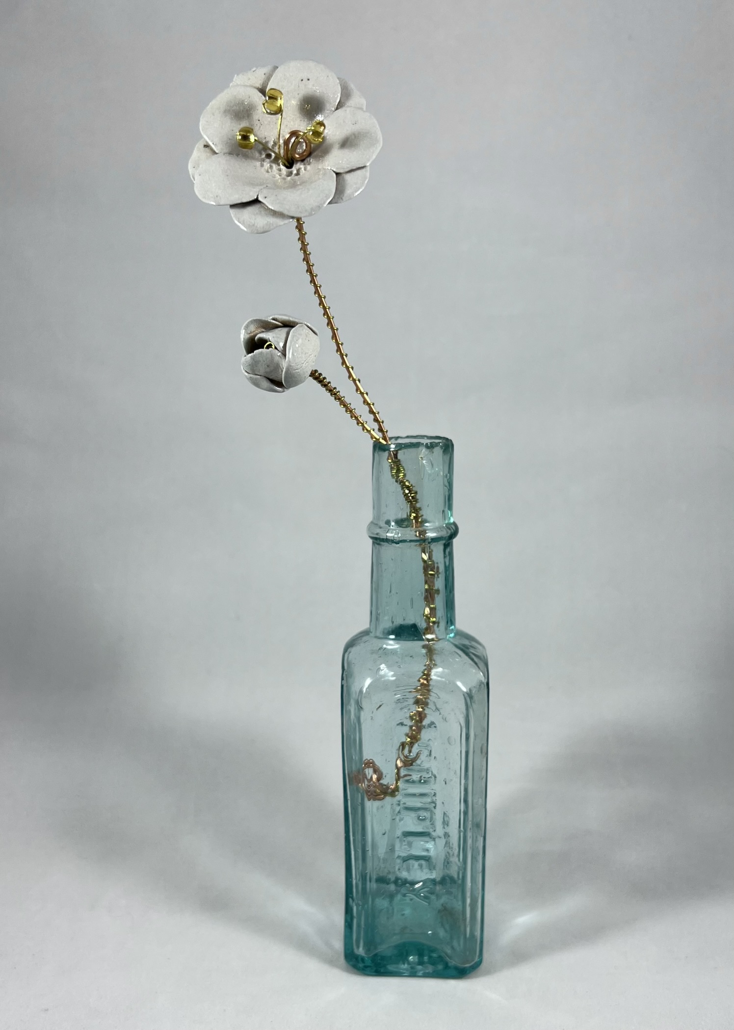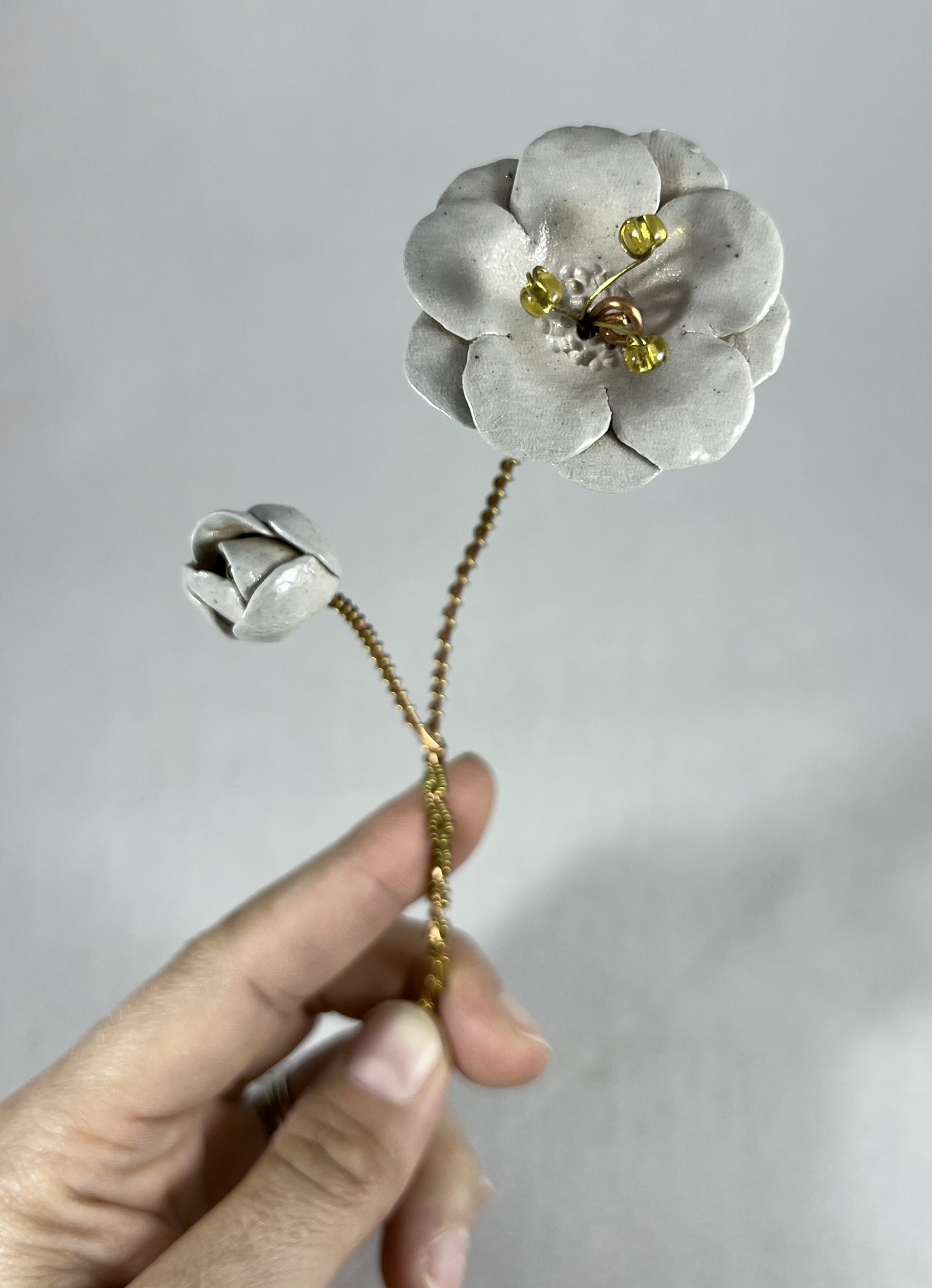 This delicate flower and bud were hand built and then salt-fired with no glaze, giving the surface a lovely and subtle texture. Wire and beads were then used to create a simple stem that can be bent and adjusted to custom fit your vase.