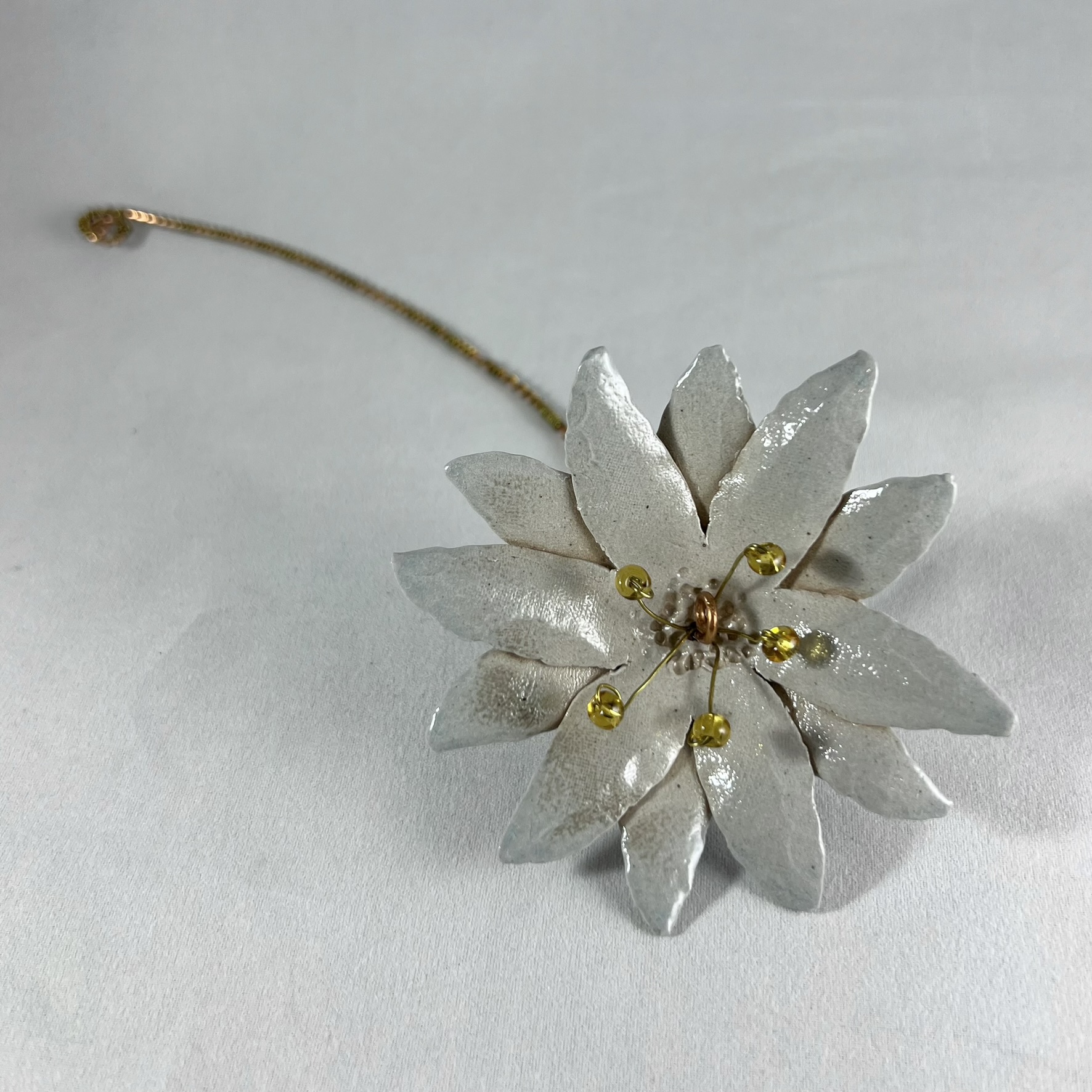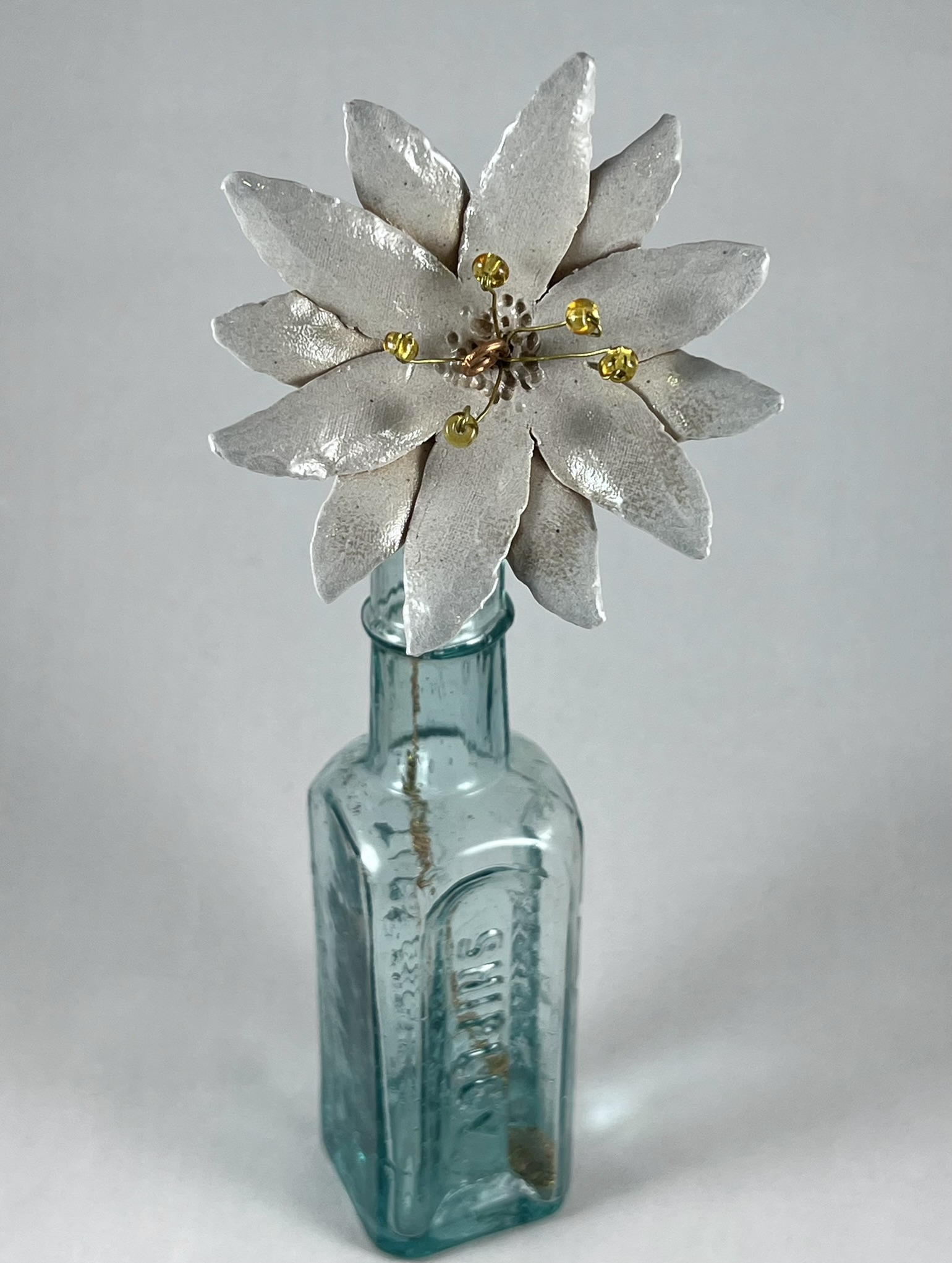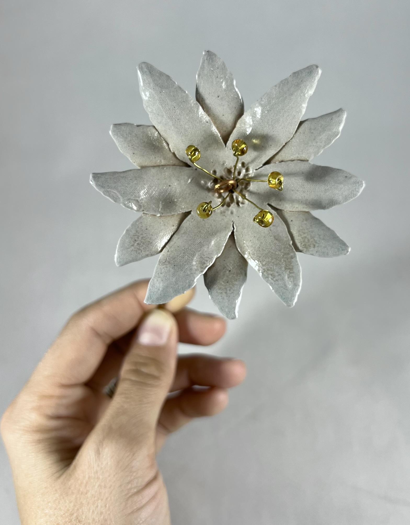 This delicate flower was hand built and then salt-fired with no glaze, giving the surface a lovely and subtle texture. Wire and beads were then used to create a simple stem that can be bent and adjusted to custom fit your vase.