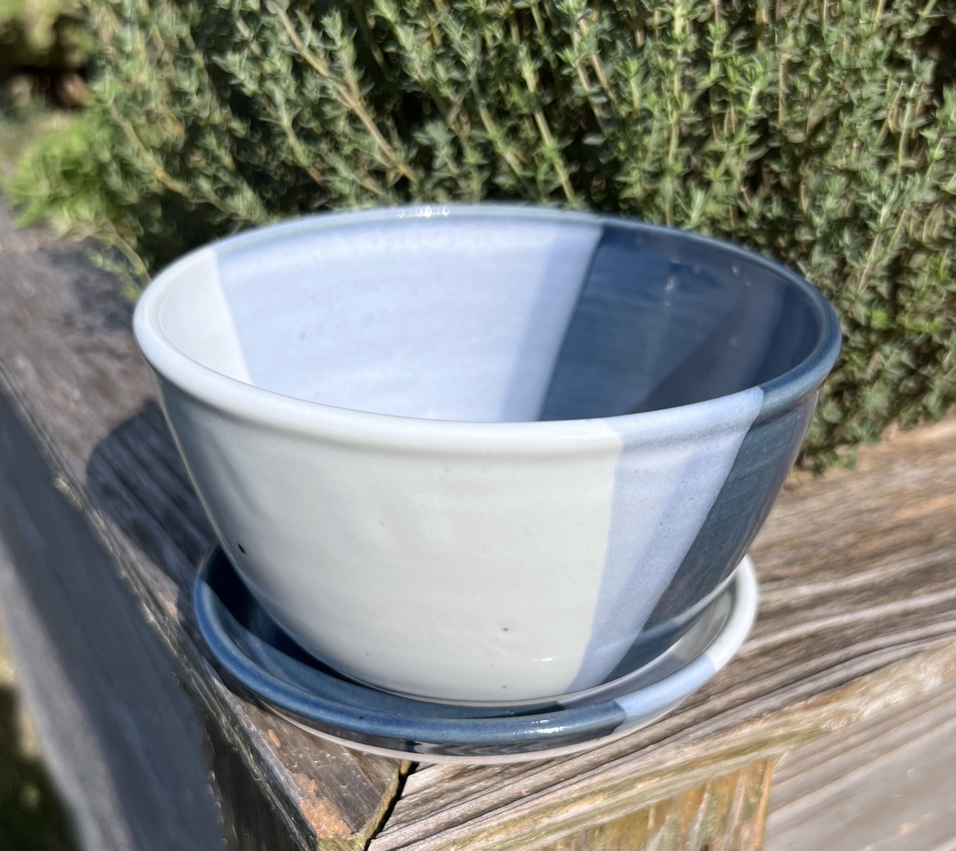 This medium bowl-shaped planter has a ombre blue layered glaze.